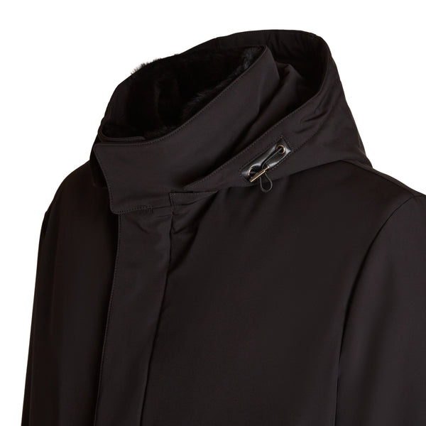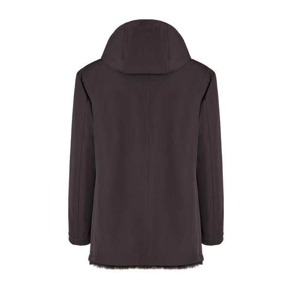 Cappotto che combina lo stile raffinato e funzionalità. Il capo dal look essenziale è realizzato in tessuto tecnico idrorepellente foderato in caldo shearling staccabile. Modello versatile che si rivela pratico poiché il capo esterno può essere utilizzato separatamente, rimuovendo la fodera per l'attacco stagione.