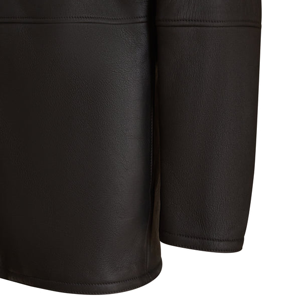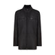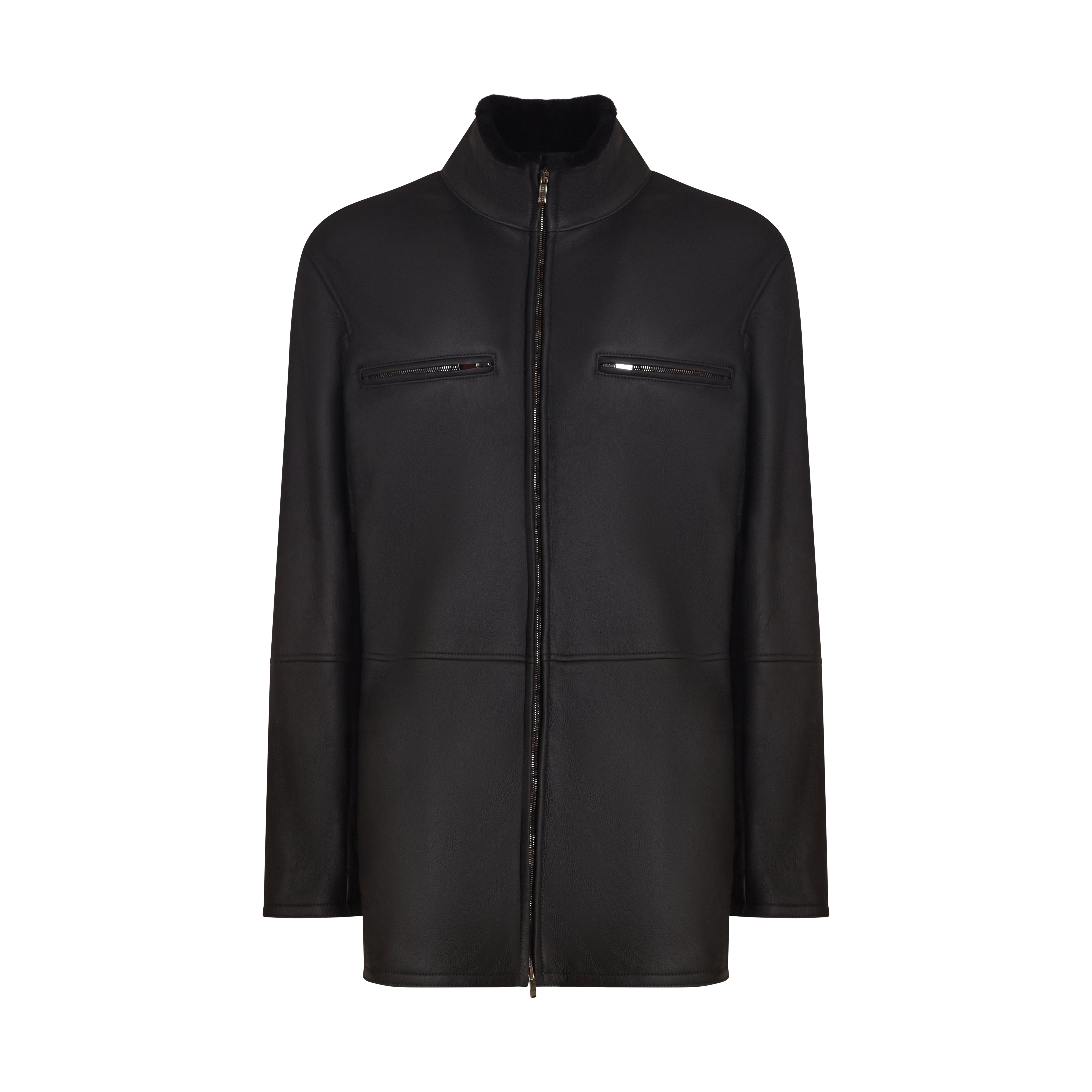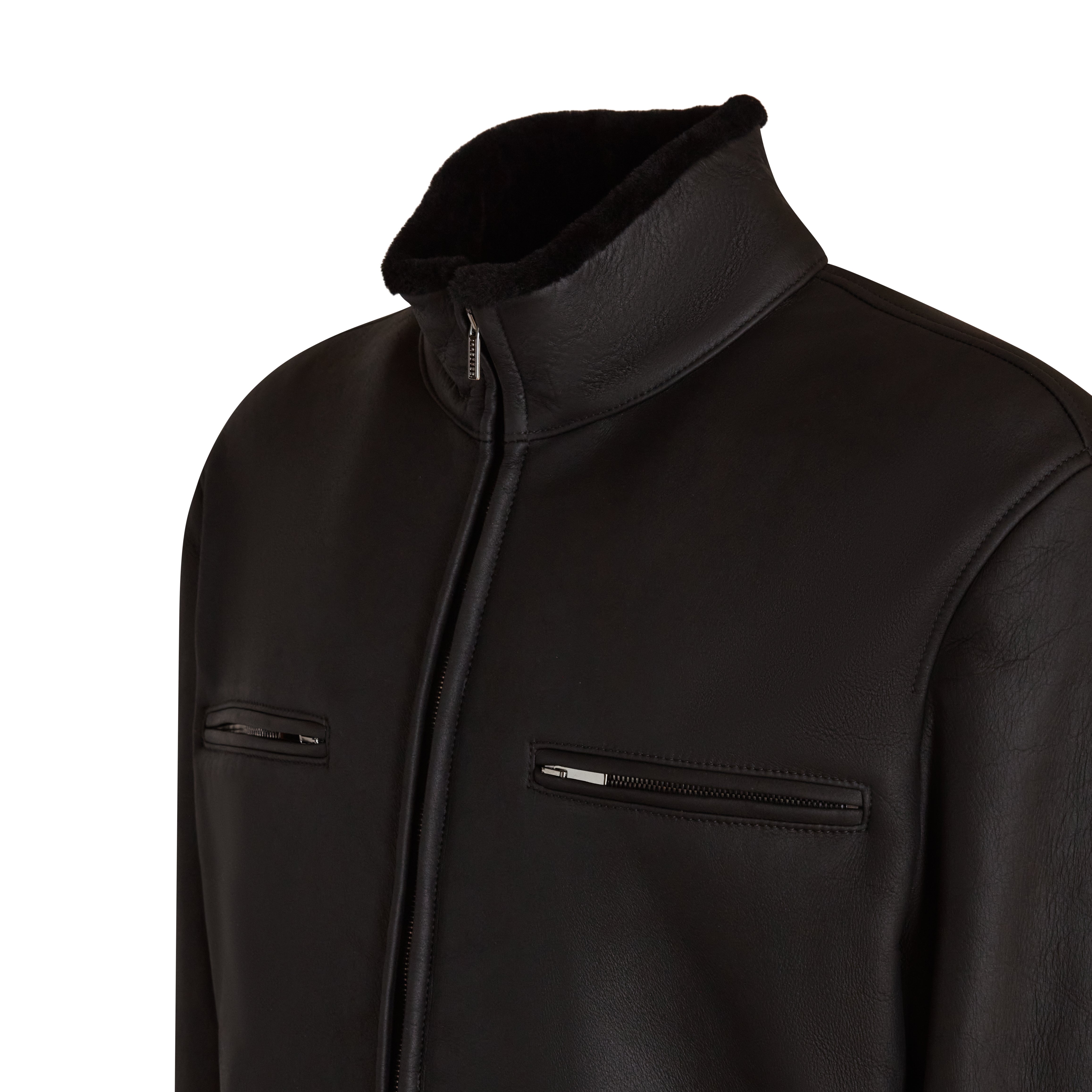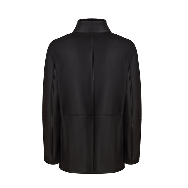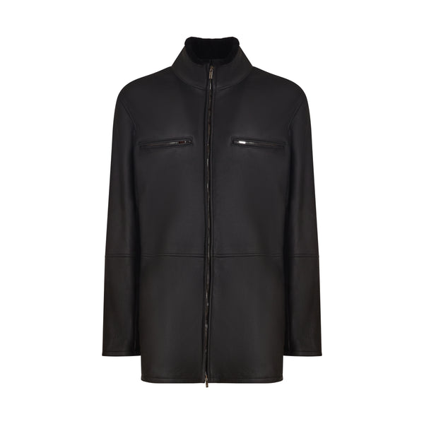 Giacca in raffinato shearling con effetto scamosciato di colore nero. Il design del capo è essenziale, con collo alto, chiusura centrale e tasche alte dotate di zip, mentre le basse sono a taglio. Rigoroso e contemporaneo per tutti gli outfit invernali.