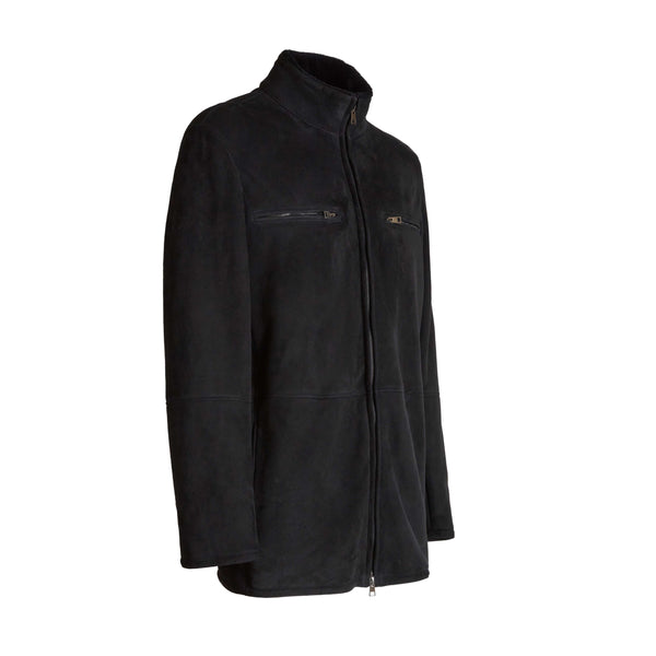 Giacca in raffinato shearling con effetto scamosciato di colore blu intenso. Il design del capo è essenziale, con collo alto, chiusura centrale e tasche alte dotate di zip, mentre le basse sono a taglio. Rigoroso e contemporaneo per tutti gli outfit invernali.