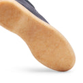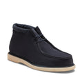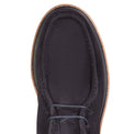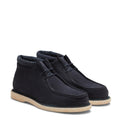 Edler Zwei-Loch-Wüstenstiefel aus weichem marineblauem Wildleder. Schuh mit lässigem Look, der sich durch stilvolle Details wie den Rahmen auszeichnet, der mit dem gleichen Leder wie das Obermaterial überzogen ist. Flexible und leichte bernsteinfarbene Gummisohle.