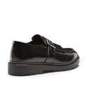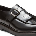 Abgerundeter Loafer aus schwarzem Glattleder mit von Hand ausgeführtem Schleifbürstfinish, das für schönen Glanz sorgt. Der Schuh zeichnet aus durch Fransen und eine Schnalle, was ihn zur perfekten Kombination aus formalem Erscheinungsbild und unverwechselbarem Design macht. Ausgestattet mit einer Polyurethansohle mit handgenähtem Rahmen und einer weichen flexiblen Oberschicht für ein hohes Maß an Fußkomfort. Die Laufsohle garantiert Robustheit und rutschfesten Grip.