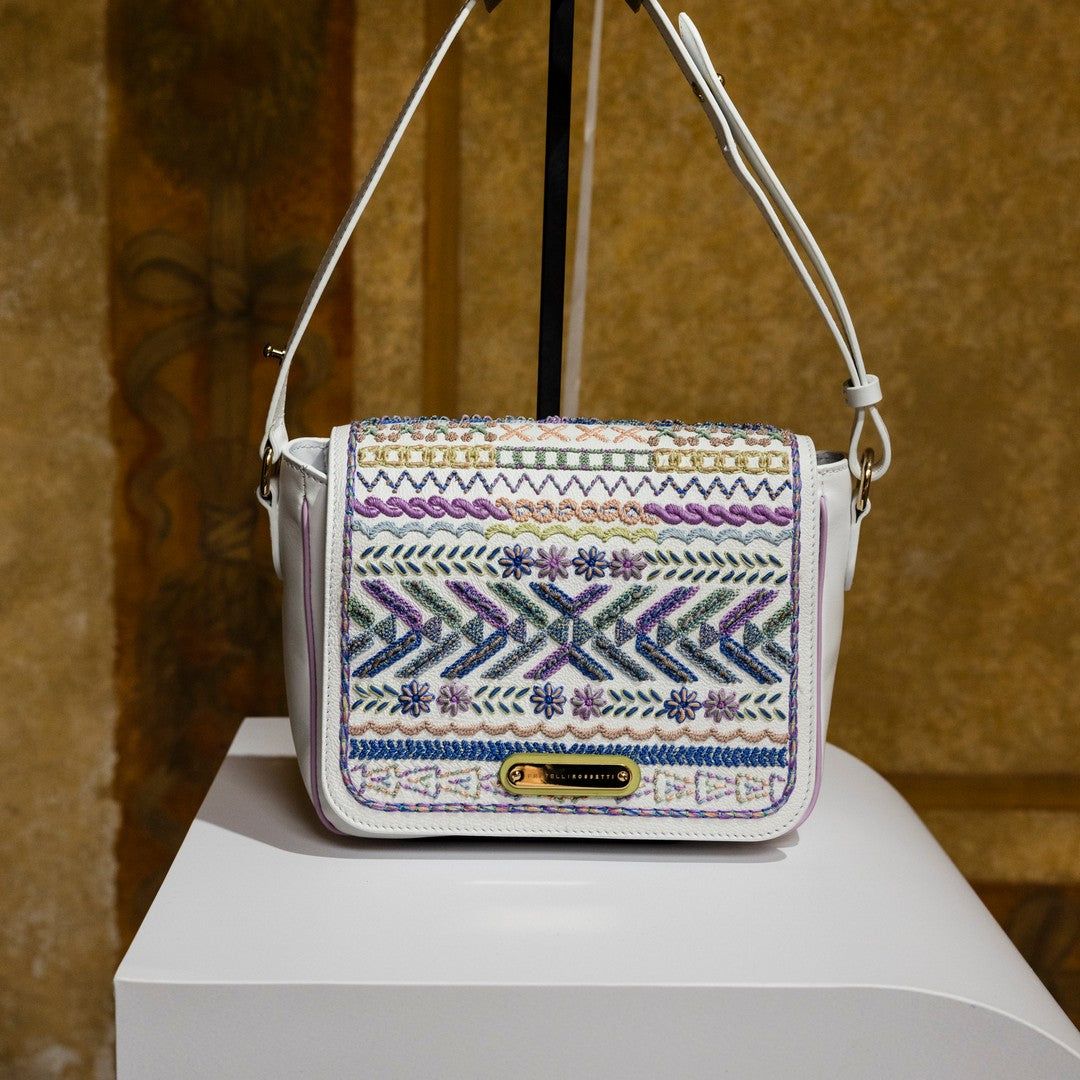 The Hobo slipper is hand-embroidered with colorful and fresh geometric patterns, almost creating a three-dimensional effect.