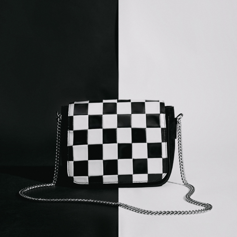 Brera Check: Here the checkerboard theme reaches its highest artisanal expression. The pattern is not printed but created through meticulous hand inlay work of two contrasting leathers, merging black and white in a perfect geometric embrace.
