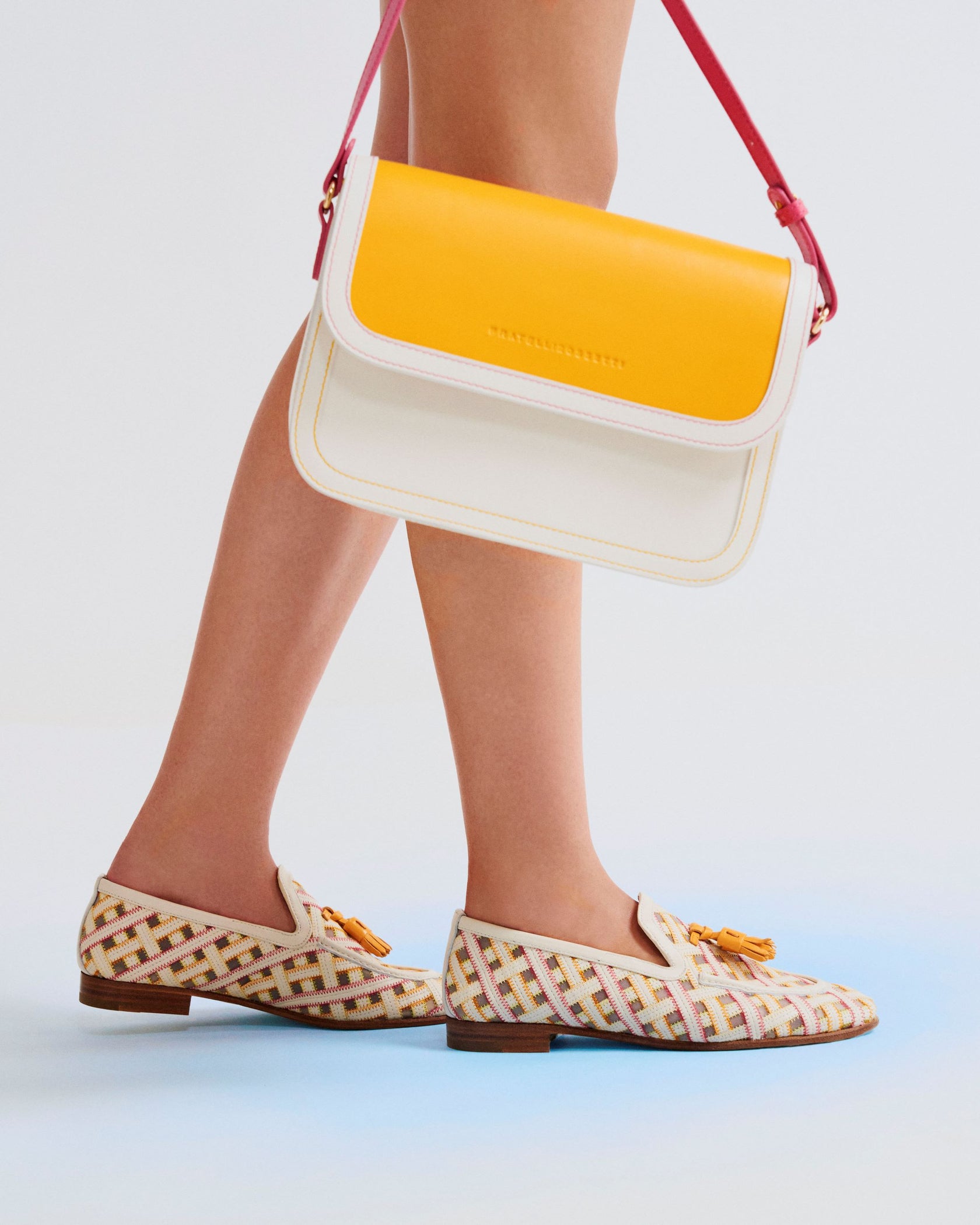 The first is a stylistic and technological evolution that celebrates the combination of traditional craftsmanship and creative experimentation; the weave is created using leather strips, sewn in a zig-zag pattern with different colored threads on a mesh support, creating a three-dimensional effect. The iconic Brera model is joined by the slipper, ballerina flat and baby sandal. The dominant colors recall those of the earth, almond, olive, must and mango.