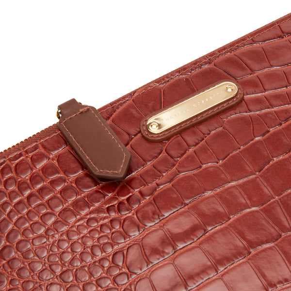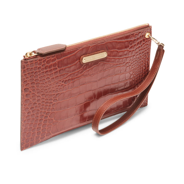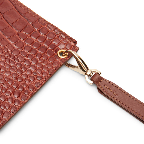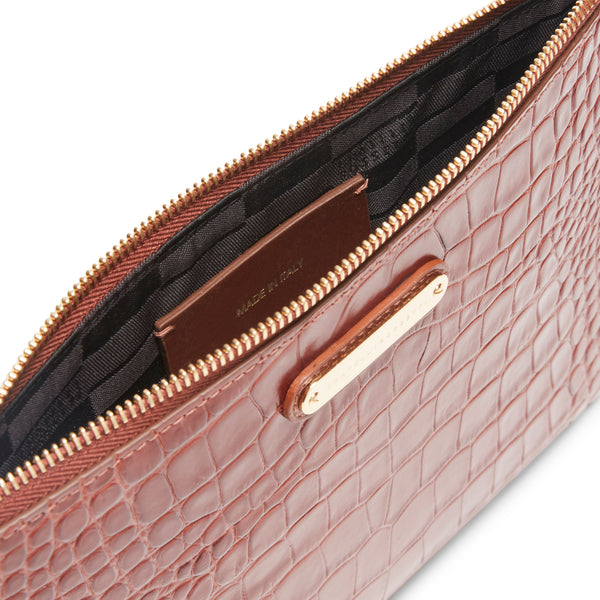 Pouch with a minimal look made of soft crocodile-effect printed leather. Closure with leather zip pull. Convenient and functional, it allows you to store small personal effects inside. The removable sleeve allows it to be worn both as a clutch and as a wallet. Logoed lining.