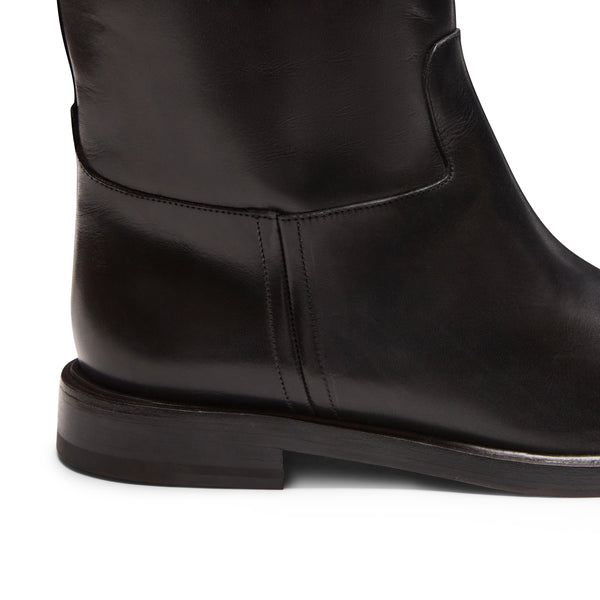 Contemporary lines and artisanal finishes determine the mannish look of the boot made of smooth black leather with an antiqued appearance. Featuring a tube fit and an almond-coloured upper band that creates a refined contrast. Leather sole with rubber insert.