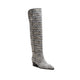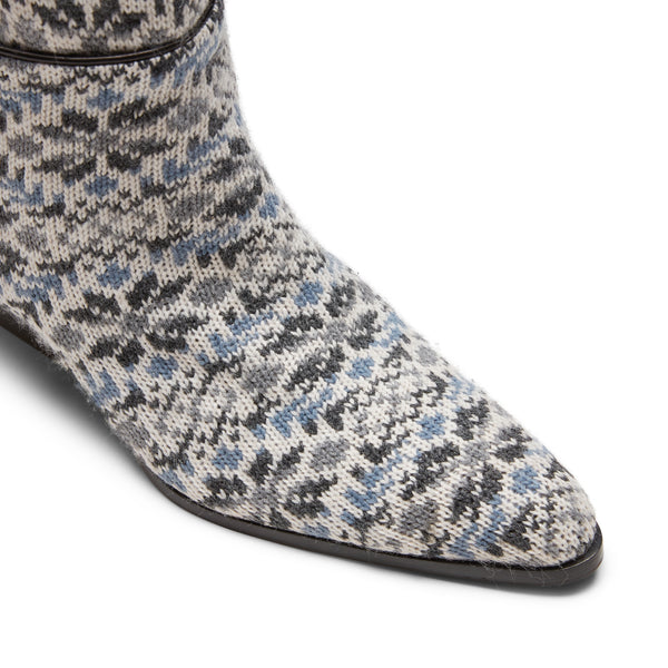 Thigh-high boot with a sophisticated look made from a wool blend fabric featuring a typical winter pattern reminiscent of warm hand-knitted sweaters. A design characterised by a tapered shape and 50 mm camperos-style heel, for a glamorous look with a country-inspired touch. The soft tubular shaft envelops the leg, while the contoured rear section provides a comfortable fit. Leather sole with rubber insert.