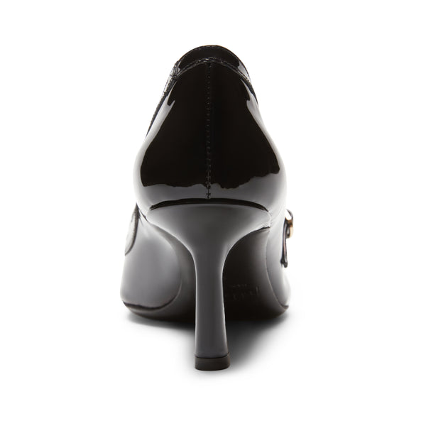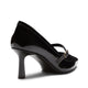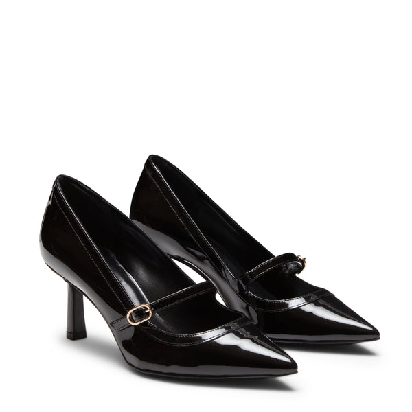Raffinata décolleté in vernice nera, modello elegante e femminile per eccellenza. Il cinturino con fibbia regolabile dona fascino retrò a questa calzatura dalla forma sfilata. Suola in cuoio nera in tono alla fodera e tacco 70 mm.