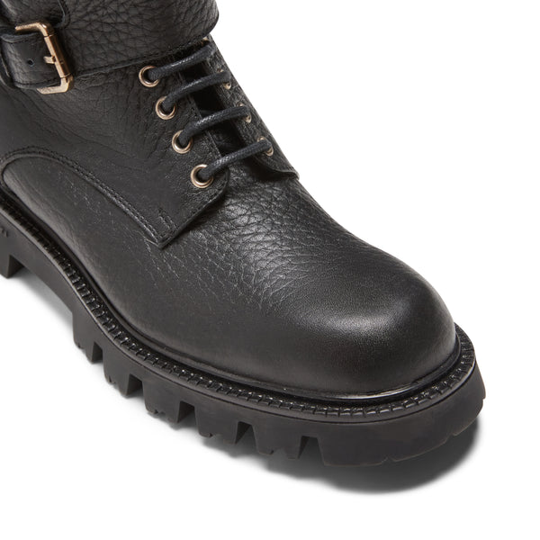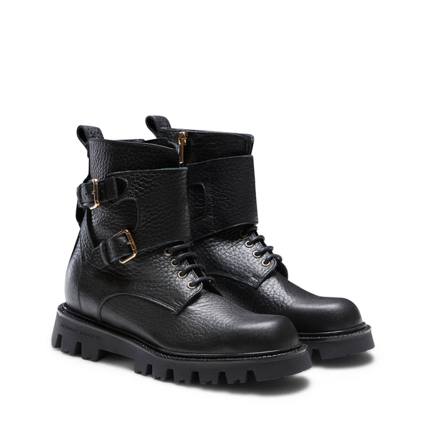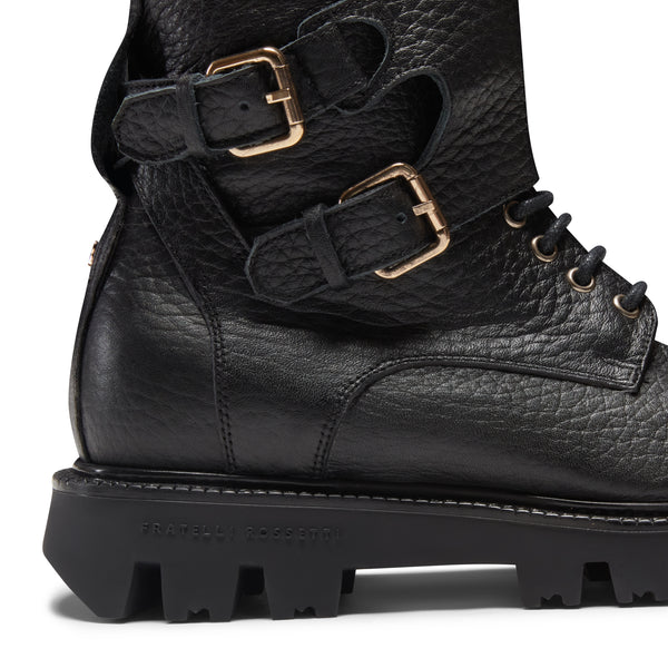 Biker boot with buckles and side zip, made of printed leather with visible grain. Boot with a gritty and urban look with an extralight rubber lug sole. Removable and breathable insole.