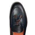 Lightweight and unlined Brera loafer made of soft, raw-cut leather. The internal edges and tassels, which are smoothed and waxed in a contrasting colour, underline the artisanal attention to detail. The welt and sole, hand-coloured by master artisans to match the navy blue-coloured upper, complete a shoe that conveys unconventional elegance.