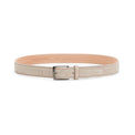 Men’s double-stitched belt with shaft, made of soft sand-coloured suede. Satin finish palladium buckle. It can be conveniently shortened to size.