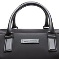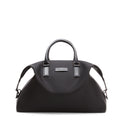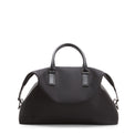 Weekender bag with a contemporary design. Roomy and lightweight, made of matte black technical nylon with matching leather details. Equipped with double handles and a shoulder strap, it guarantees comfort and versatility on every trip. Large internal compartment for storing clothing and accessories, ideal for short trips. The logo embossed on the front leather insert adds a sophisticated touch.
