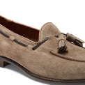 College-inspired loafer with tassels, reinterpreted in a sophisticated style. An unlined, versatile shoe, made of moss green suede, embellished with a contrasting woven leather insert that gives it a refined artisanal touch. Leather sole.