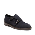 Double-buckle Derby shoe with toe cap with a refined look. Classic lines seamlessly blend with a modern aesthetic. Made of navy blue suede leather with a water-repellent treatment, with a beige-coloured textured rubber sole and leather midsole.