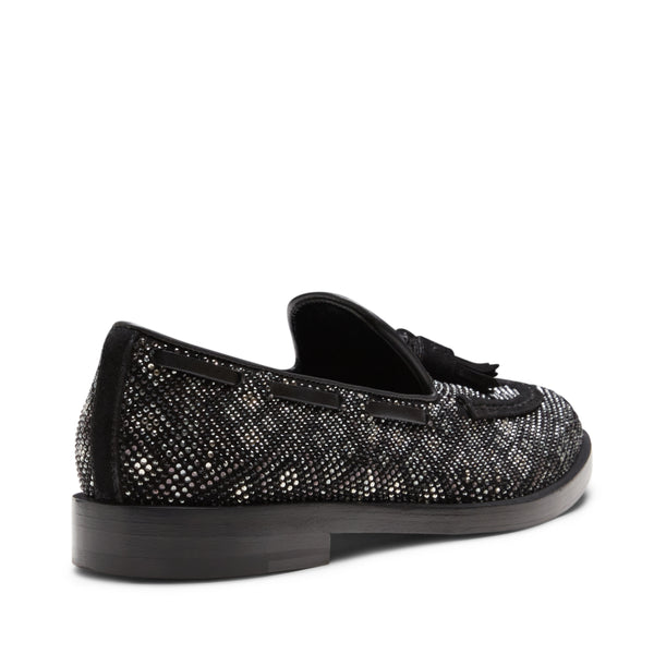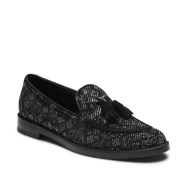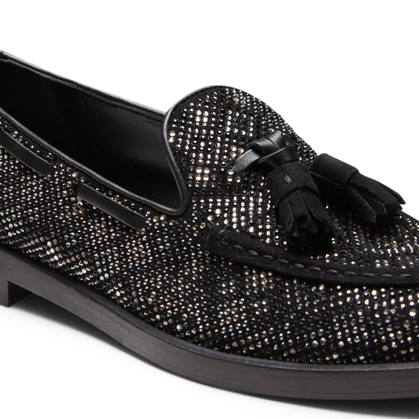 The iconic Brera loafer exudes elegance for the evening in a refined black suede version featuring a diamond-shaped rhinestone decoration that adds light and movement. The result is a shoe with a sophisticated and contemporary look. The black leather sole matches the tassels.