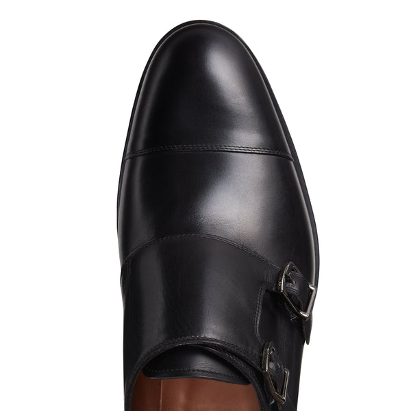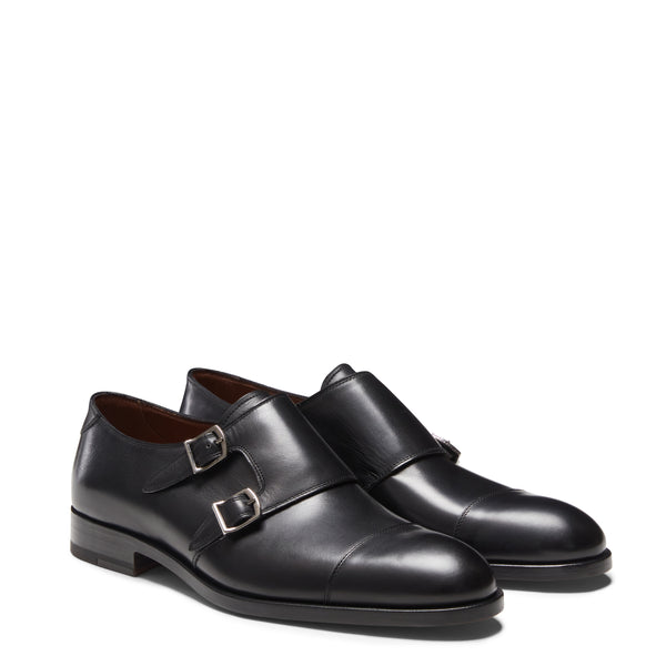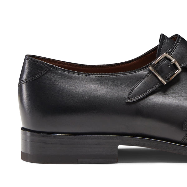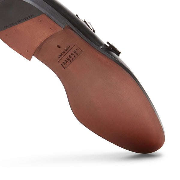 Derby con doppia fibbia con puntale dal look ricercato. Linee versatili e contemporanee si fondono con il sapiente lavoro artigianale che dona al pellame di colore nero un effetto anticato e una maggiore lucentezza. Suola in cuoio con mezzo tacco in gomma.