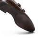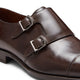 Double-buckle Derby shoe with toe cap with a refined look. The versatile and contemporary shoe is made of soft leather that is dyed ebony brown by hand-stamping. The expert craftsmanship creates a particular effect with deeper shades of color. Hand-painted leather sole.