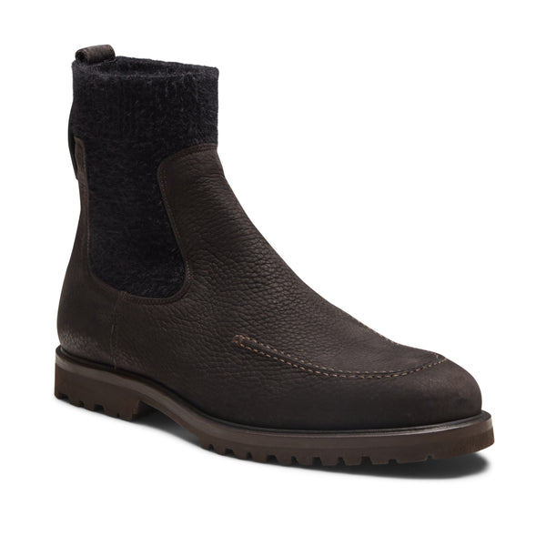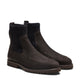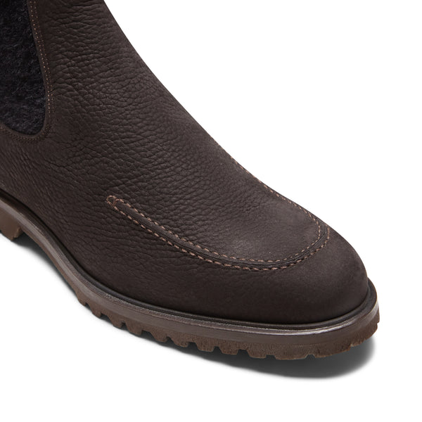 Beatles boot with a semi-square shape, crafted in soft cocoa brown tumbled nubuck. This contemporary-looking shoe is characterised by the loafer stitching and the black wool shaft. The natural latex lug sole guarantees flexibility and durability, offering a comfortable fit.