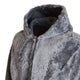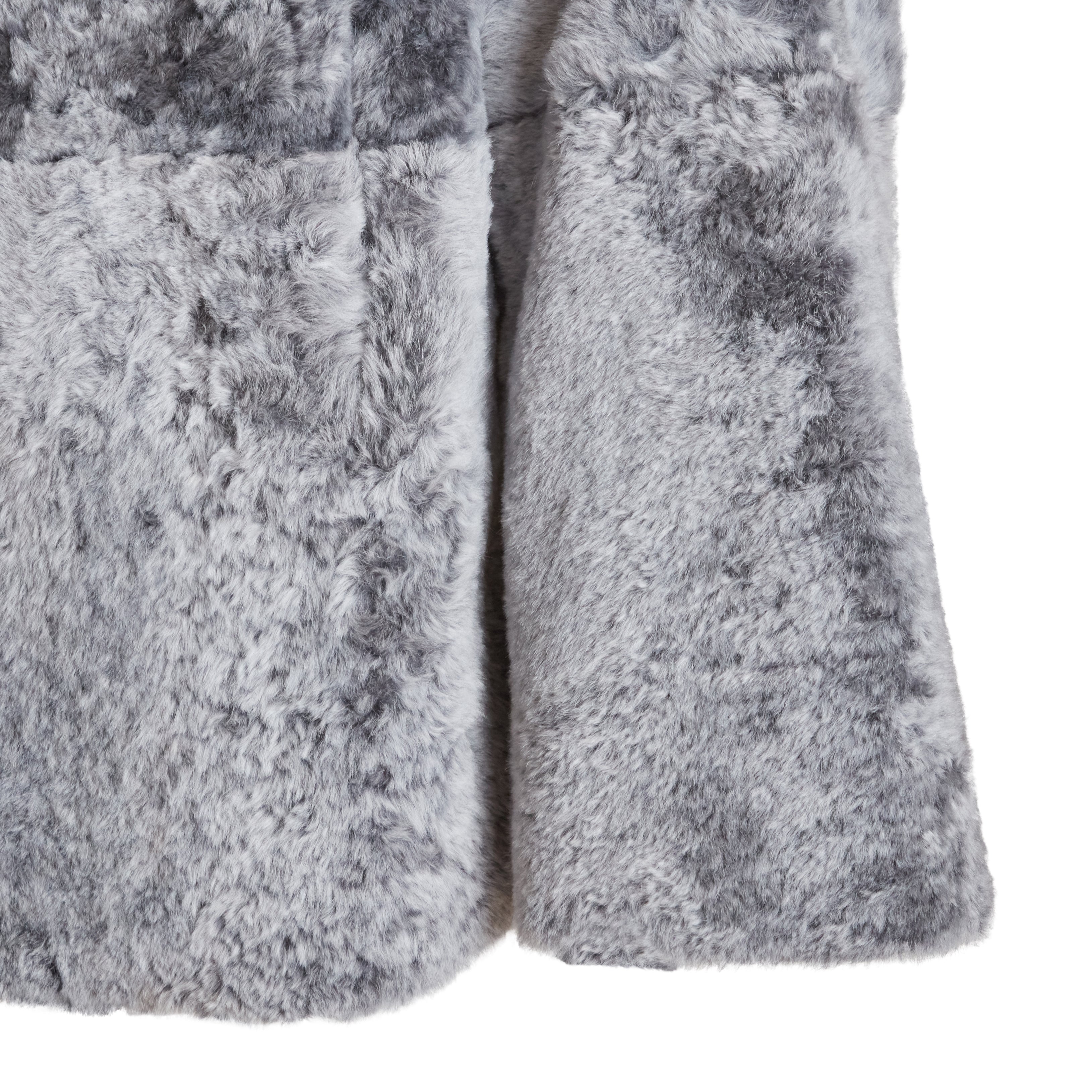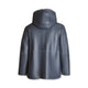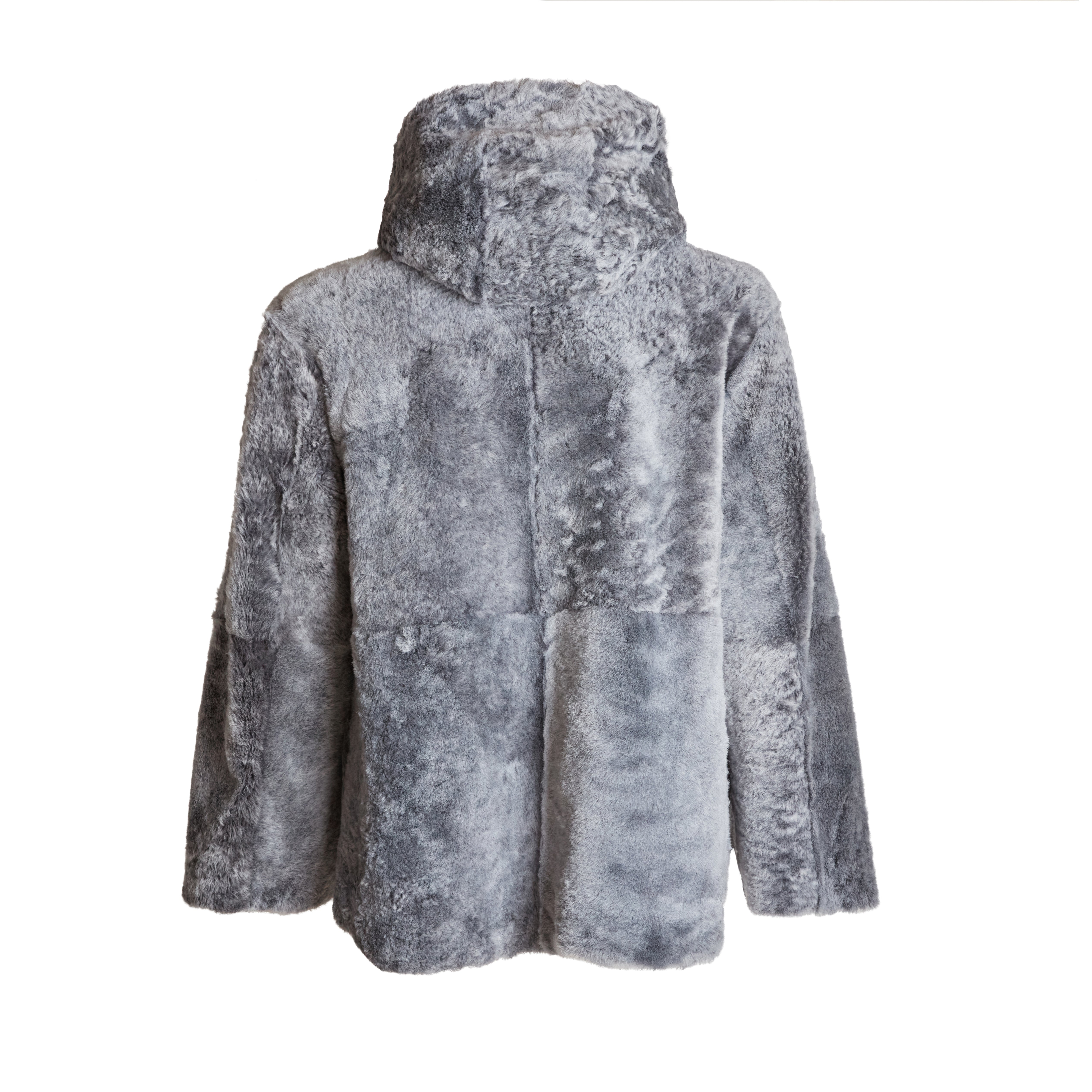 Blouson in morbido shearling nappato reversibile color grigio acciaio. Caratterizzato da ampio cappuccio, maniche lunghe e tasche inserite nei fianchi. La finitura a taglio vivo alleggerisce l'aspetto essenziale e chic del capo. Chiusura frontale con zip metallica. Disponibile in tre taglie: S M L.