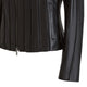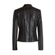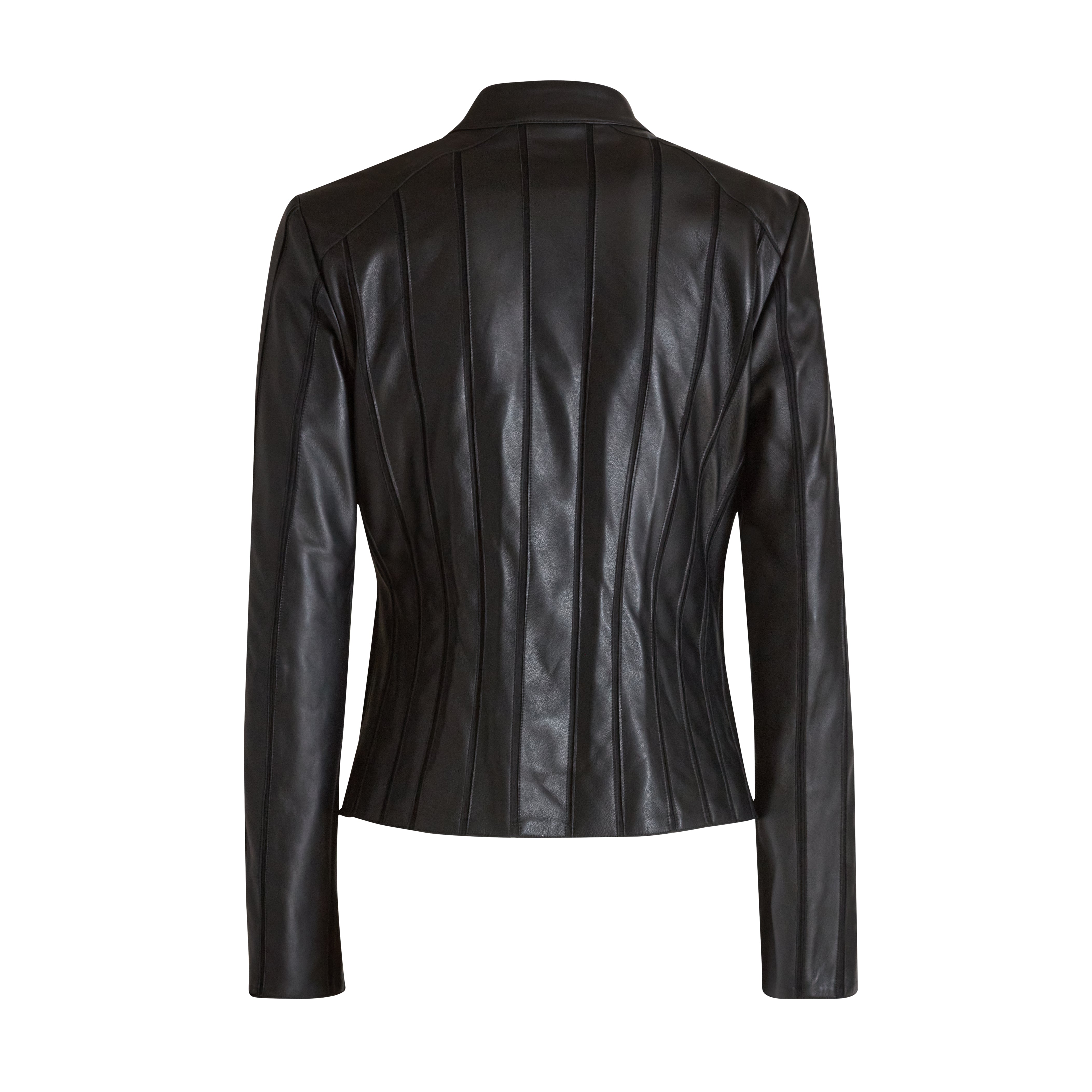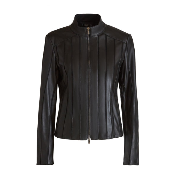 Giacca con vestibilità slim che richiama lo stile del biker con il colletto a coreana. Il capo è realizzato a partire da liste di morbida nappa nera accostate luna allaltra e cucite alla fodera in jersey di cotone elasticizzato. Il risultato è un fitting che valorizza in modo confortevole la silhouette del corpo. Chiusura con zip a doppio cursore.