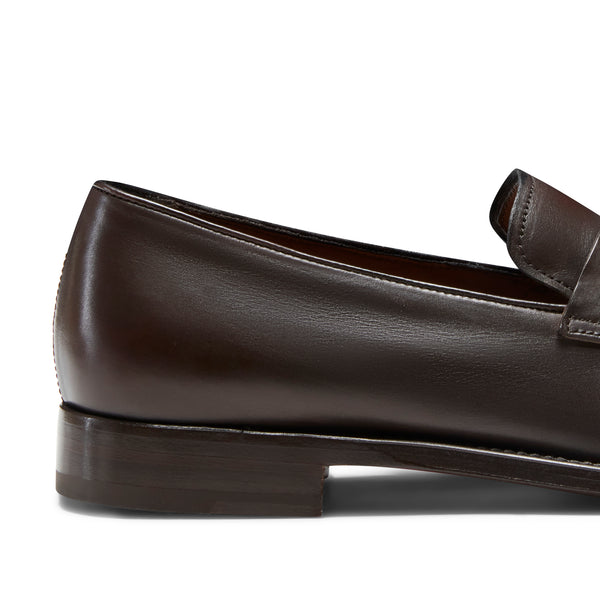 Refined band loafer made of soft, smooth unlined brown leather. The exclusive craftsmanship gives the shoe a slightly antiqued effect and enhanced shine.