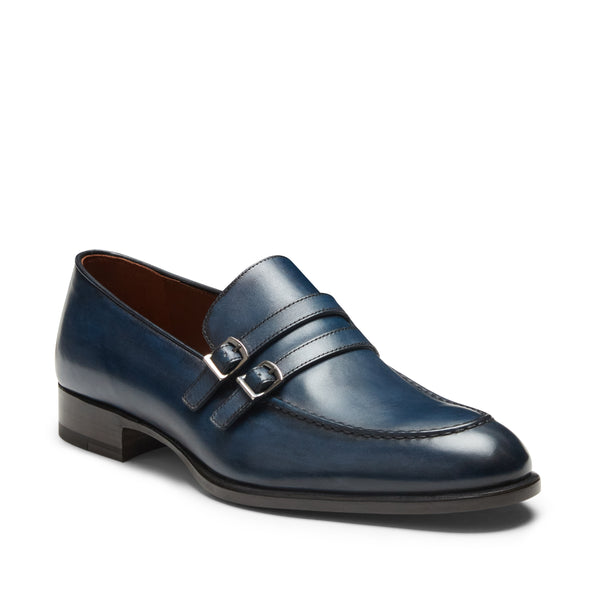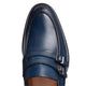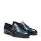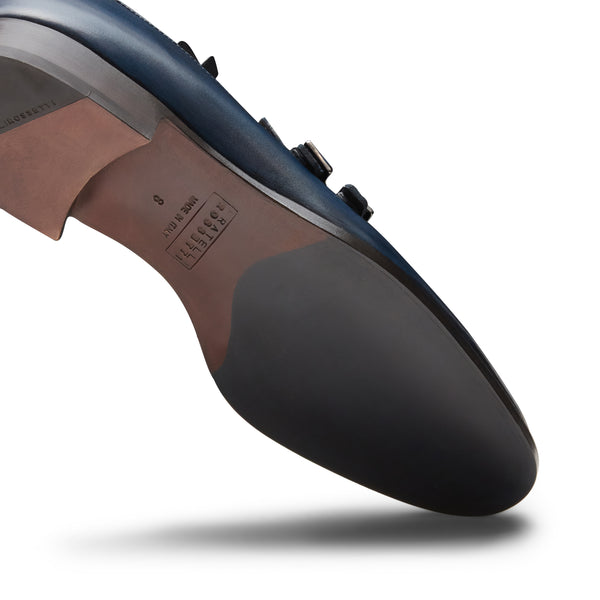 Refined artisanal-inspired loafer made of soft blue leather characterised by an exclusive craftsmanship that gives the shoe a slightly antiqued effect and an enhanced shine. Finished with two straps that accentuate the exclusive look.