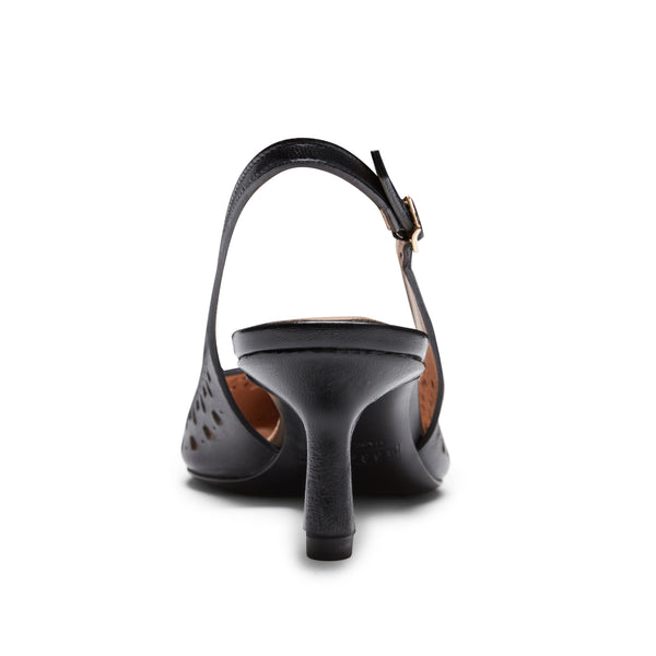 Slingback sandal with an easy-chic allure made of soft black leather. It is characterised by the unique laser processing technique that simultaneously pierces and waxes the various parts of the upper, enhancing its decoration.