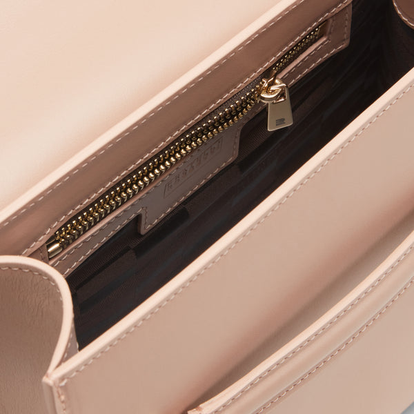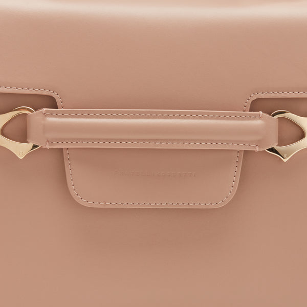 Top Handle bag from the Magenta line made of soft smooth leather. Magnetic closure Characterized by the iconic light gold clamp. With the possibility of using it over the shoulder. The main compartment is equipped with a small internal zip pocket and a pocket on the external back. Logoed lining. H21xL25xL9