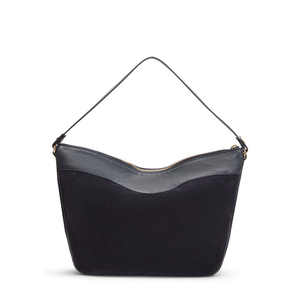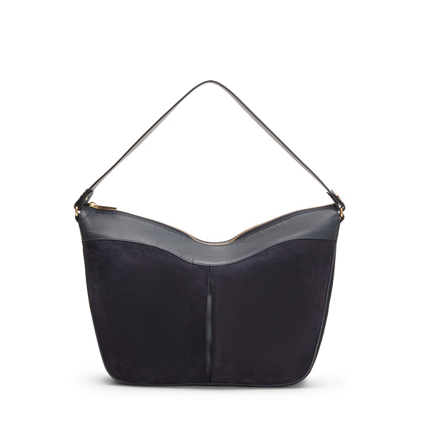 Shoulder bag from the Claire line in refined dual-material version in soft, blue suede with matching smooth leather inserts. Versatile and roomy, perfect for everyday use. Zip fastening.