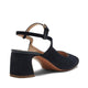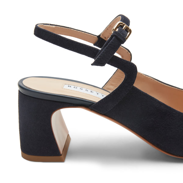 Refined slingback sandal with ankle strap made of soft navy blue suede. Sophisticated footwear that can be worn anywhere for timeless elegance. Comfortable to wear thanks to the medium heel.
