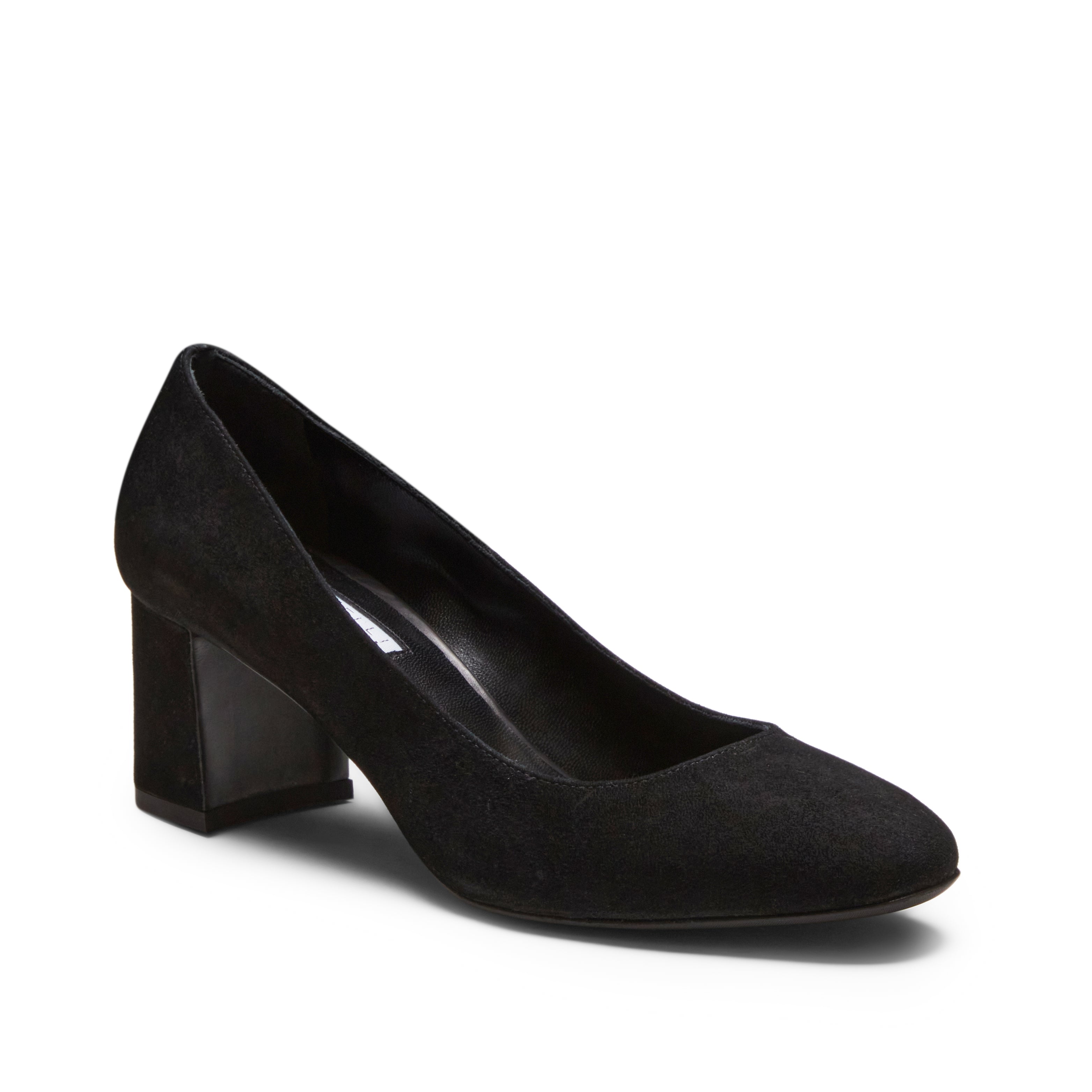 Raffinata décolleté a forma tonda dal look femminile ed essenziale, realizzata in pelle scamosciata nera dal fascino intramontabile. Il tacco largo 60mm assicura comodità e versatilità per gli outfit quotidiani. Suola in cuoio con inserto in gomma.