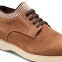 Four-hole Derby shoe with a rounded shape. This shoe features a sock-style top in stretch ribbed fabric for a comfortable fit. Made of soft chestnut brown suede. Lightweight, flexible and durable rubber compound sole.