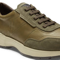 Sporty suede leather sneaker featuring smooth moss green leather. The leather is dipped in colour and then brushed, the perfect blend of sportswear and sophisticated details. This shoe features stitching on the sides of the upper that creates geometric designs. Special two-tone rubber sole.