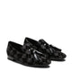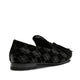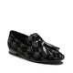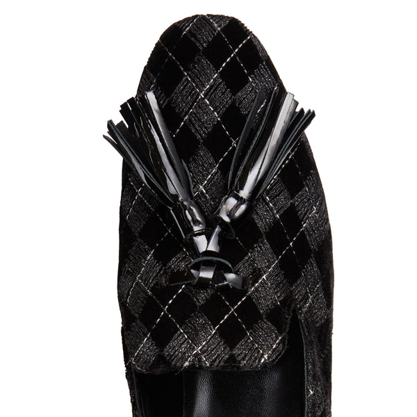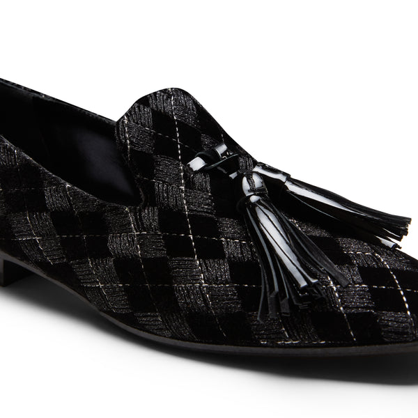 The iconic Hobo slipper exudes elegance in the evening, with a refined black velvet adorned with intricate geometric embroidery and subtle silver Lurex thread inserts, adding a delicate shimmer. Oversized matching patent leather tassels complete the design, bringing an elegant, contemporary look to the shoe. The black leather sole matches the lining.