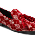 The iconic Hobo slipper exudes elegance in the evening, with a refined red velvet adorned with intricate geometric embroidery and subtle silver Lurex thread inserts, adding a delicate shimmer. Oversized matching patent leather tassels complete the design, bringing an elegant, contemporary look to the shoe. The black leather sole matches the lining.