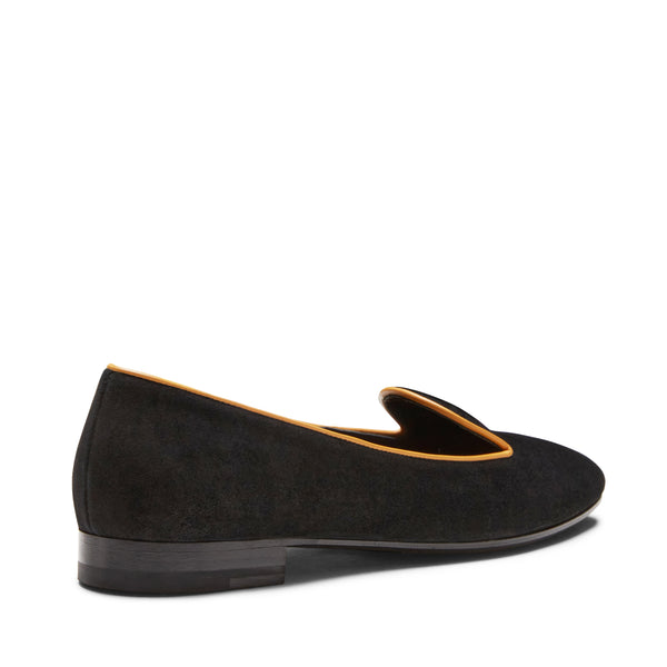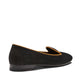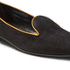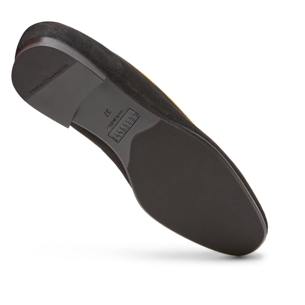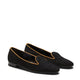 Tailored-look slipper, made of soft petrol-colored velvet. Model characterised by its simple and elegant line, defined by the contrasting colour hem. Perfect for completing outfits with a sophisticated and feminine touch. Black leather sole matching the lining and upper.