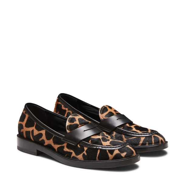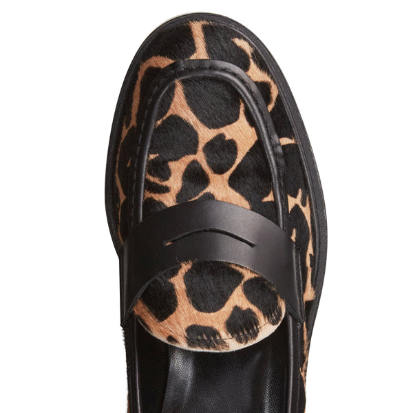Band loafer with a chic and casual look. Made of soft pony-effect leather in a sophisticated animal print pattern, featuring a contrasting smooth leather band. Leather sole with rubber half-heel.
