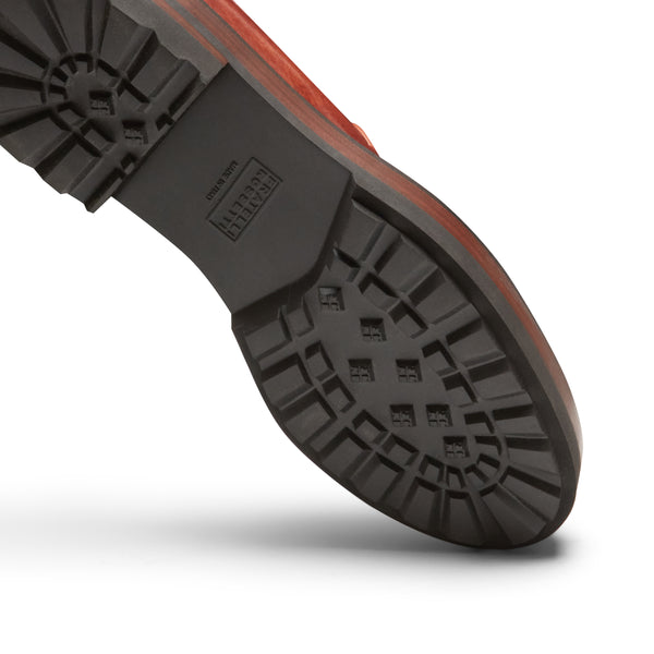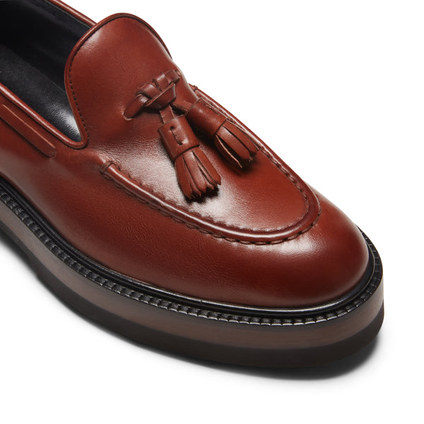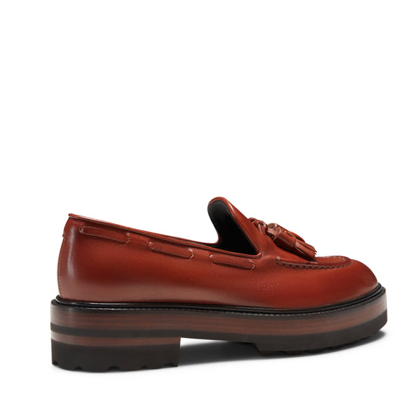 Iconic Brera loafer made of smooth leather with handcrafted antiqued effect and tone-on-tone tassels. With a rubber lug sole and leather insert, these shoes are the perfect combination for a modern androgynous look.
