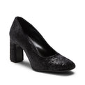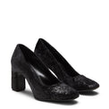 Square-toe pump made of soft pony-effect fabric in a sophisticated shiny black colour. The wide 80 mm covered heel makes it comfortable for adding an extra chic touch to day and evening outfits. Leather sole with rubber half-sole.