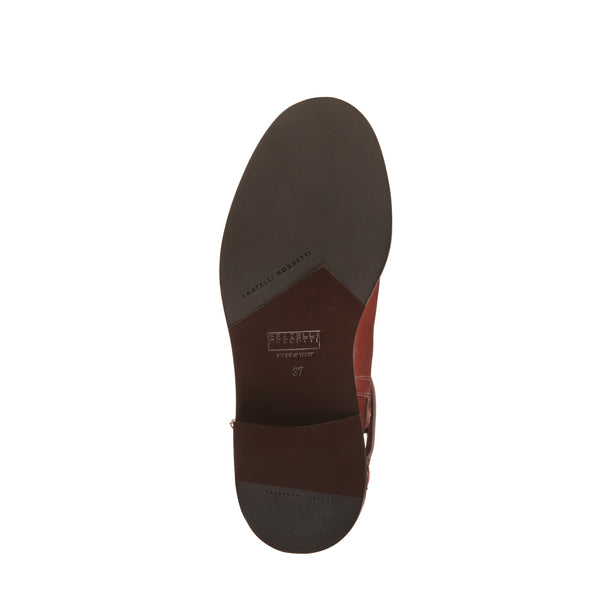 Magenta ankle boot made of black leather with a handcrafted antiqued effect. This iconic design makes a statement with its refined details: straps with waxed raw-cut edging and a logoed gold metal stirrup incorporated into the heel. A masculine look that reveals a refined handcrafted character. Leather sole with rubber insert.