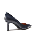 Pump with a slightly pointed toe for a refined and essential look. Made of soft, smooth navy blue leather. Perfect for adding a feminine touch to any outfit.