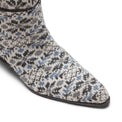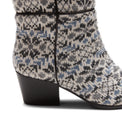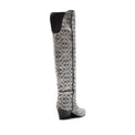 Thigh-high boot with a sophisticated look made from a wool blend fabric featuring a typical winter pattern reminiscent of warm hand-knitted sweaters. A design characterised by a tapered shape and 50 mm camperos-style heel, for a glamorous look with a country-inspired touch. The soft tubular shaft envelops the leg, while the contoured rear section provides a comfortable fit. Leather sole with rubber insert.