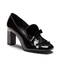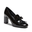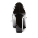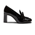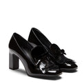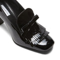 Slipper a forma squadrata declinata in tacco alto 80mm. Realizzata in vernice nera, si caratterizza per linee femminili e raffinati dettagli come la mascherina decorata con frangia e fiocchetto. Calzatura chic e bon ton, dona eleganza e ricercatezza. Suola in cuoio nera in tono alla fodera.