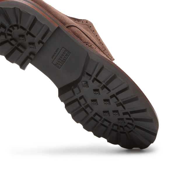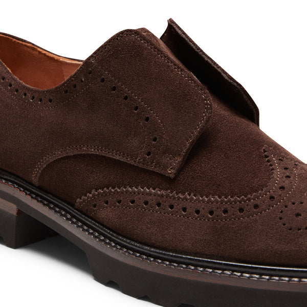 Dandy, the laceless derby, for the winter season highlights the traditional artisan details of the brogue shoe with perforations and a flower on the toe. Perfect masculine look in water-repellent cocoa-colored suede. Rubber sole with leather midsole.