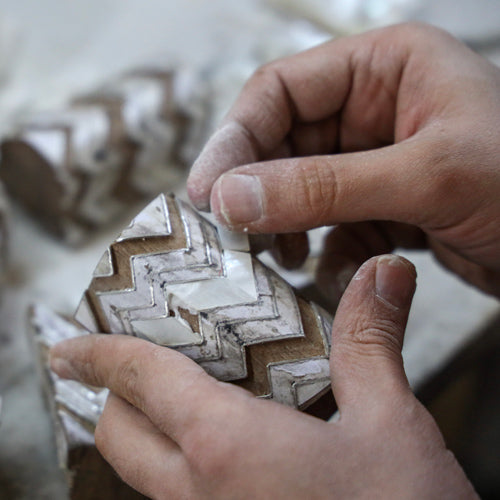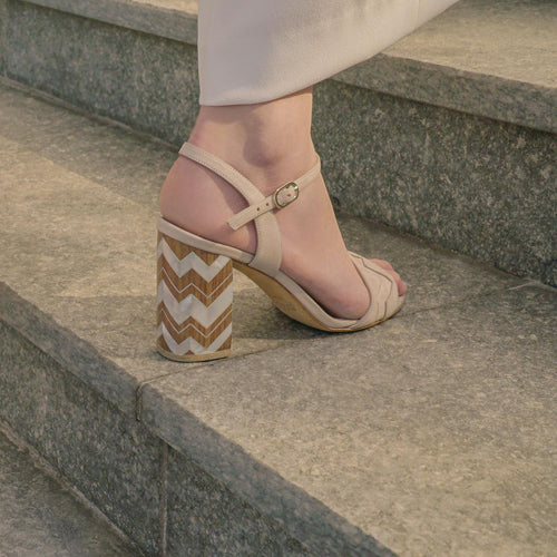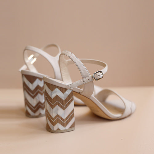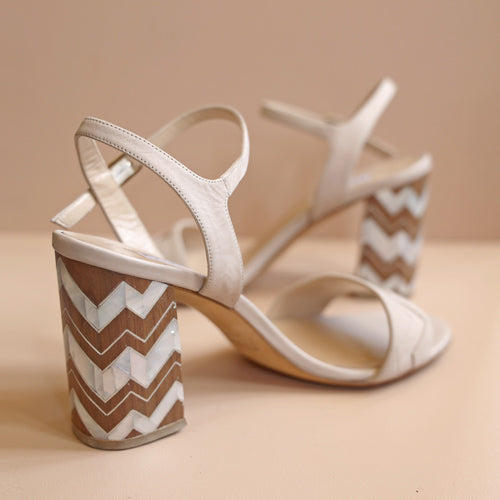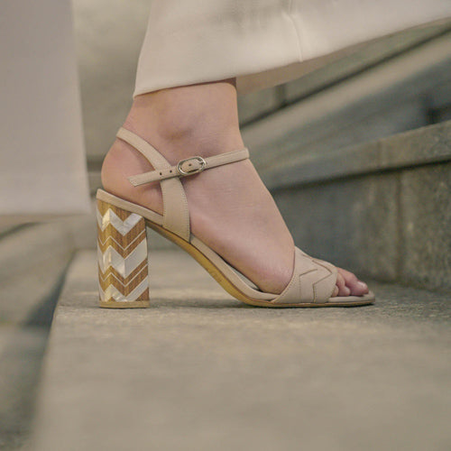 Nada Debs, rivisitando in modo contemporaneo la tecnica della lavorazione della madreperla su legno massello in noce naturale, ha creato un tacco unico caratterizzato da un motivo grafico a zig zag. Un pattern che simboleggia il battito del cuore pulsante di Milano e Beirut, importanti poli creativi sulla mappa del design internazionale.
