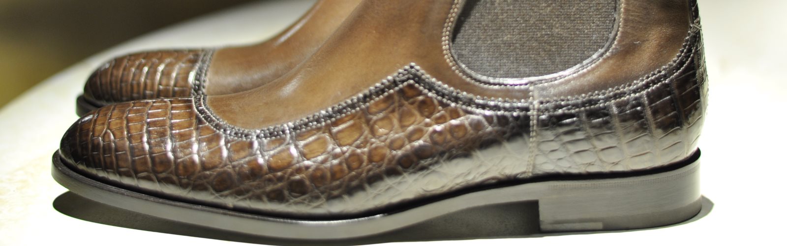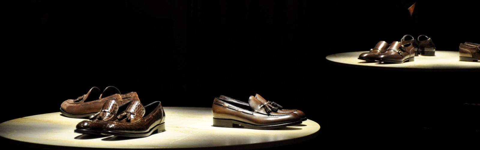 L’artigianalità è protagonista dei 5 modelli, grandi classici dell’azienda milanese: l’iconico mocassino Brera, la francesina tradizionale e quella asimmetrica, la doppia fibbia e lo stivaletto. Il filo conduttore è il color ebano, dipinto a mano dai maestri artigiani Fratelli Rossetti. Due le tecniche utilizzate: la lavorazione Toledo che prevede l’applicazione del colore direttamente sulla pelle grezza montata su forma creando un effetto “glossy”; nell’altra, detta Liverpool, il pellame viene decolorato e riapplicato, dando vita a sfumature molto intense. La tecnica Toledo viene presentata in abbinamento al suede e nella versione, più preziosa, con il coccodrillo dipinto, a sua volta, artigianalmente.