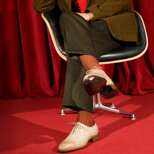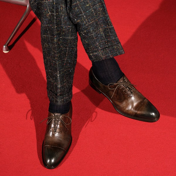- Riflessiva - Una francesina dal gusto classico realizzata seguendo la forma storica, dipinta a mano con giochi di bicolore e dettagli che sottolineano la ricercatezza della scarpa. Il decoro è realizzato con la tecnica tradizionale delle bucature. Una calzatura perfetta per l’uomo di città che ama osservare e scoprire nuovi spazi.