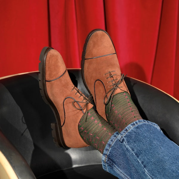 - Spensierata - Una calzatura in vitello scamosciato con una suola con battistrada in carro leggero. Il dettaglio grafico è disegnato attraverso la tecnica della ceratura. Un gusto più casual con un mood più giovane.