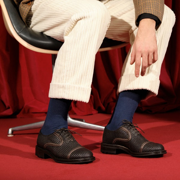 - Non chalant - Una francesina realizzata in pellame intrecciato a mano e “tuffata nel colore”. Il motivo decorativo è caratterizzato da bordi in pelle che le regalano un mood più casual. Il fondo è una suola in cuoio e gomma dallo spessore invernale ma dall’aspetto e dal peso leggero. Adatta a chi vuole godersi ogni istante e piacere della vita.