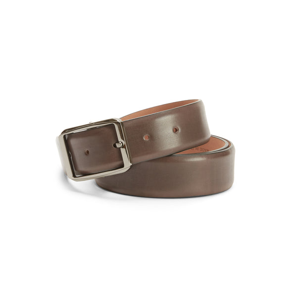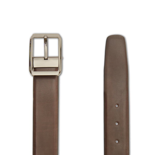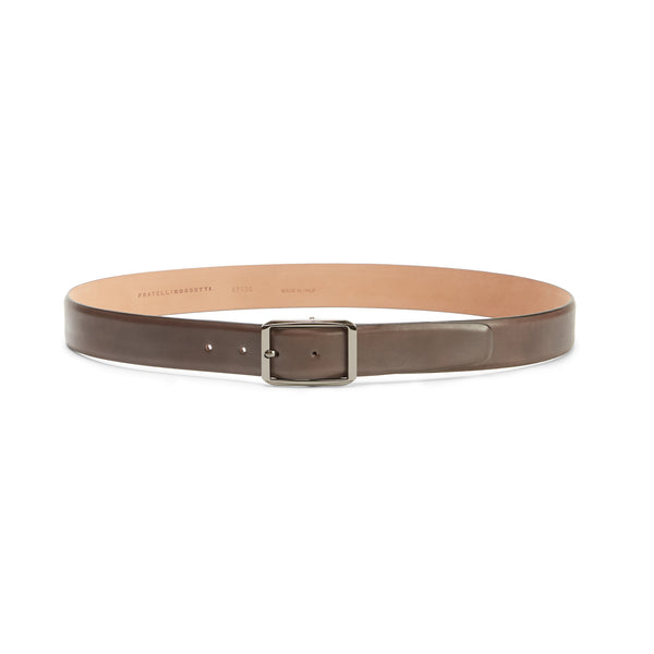 Cinturón para hombre con banda sin costuras, diseñado en piel suave teñida en color marrón ébano mediante un tamponado hecho a mano. La experta artesanía crea un efecto particular con tonos de color más intensos. Hebilla de paladio con acabado satinado. Altura 35 mm.